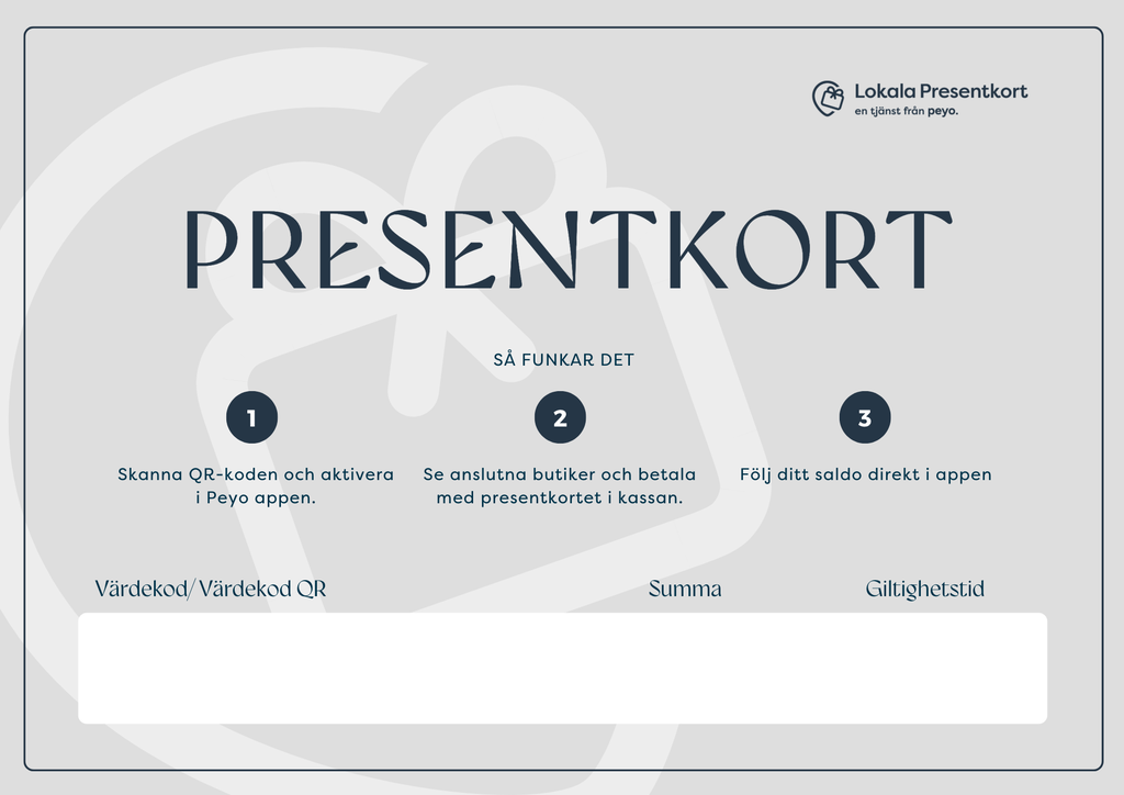 Presentkortet levereras som en smidig värdekod, som enkelt löses in via Peyo-appen. Därefter kan mottagaren handla i alla de butiker, restauranger, caféer och andra verksamheter som är anslutna i Jönköping. När du har gjort din beställning, får du koden, instruktioner och en utskrivbar bild direkt till din mail. Har du ingen skrivare? Inga problem! Du kan skriva koden på vilket grattiskort du vill. Gör någon glad med en present som gör skillnad – ett smart, enkelt och hållbart val!